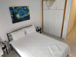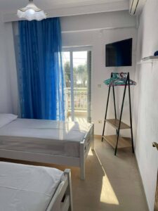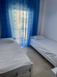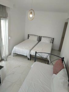 Апартманот е наменет за 5 лица.Се наоѓа на 30м од плажа.Има две спални соби во едната има брачен кревет а во другата соба има 3 единечни кревети.Бања,тераса и кујната која е целосно опремена за приготвување на лесна храна.