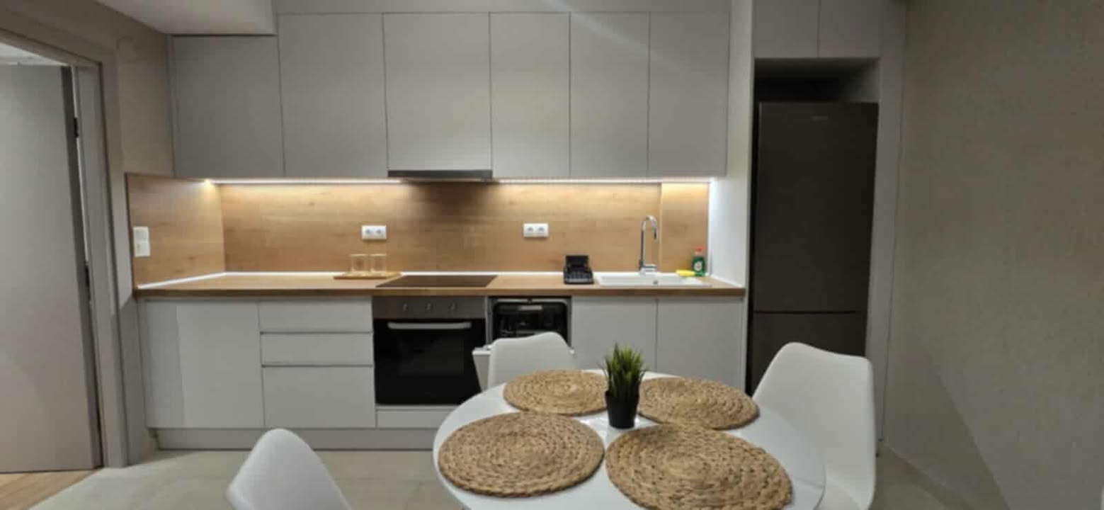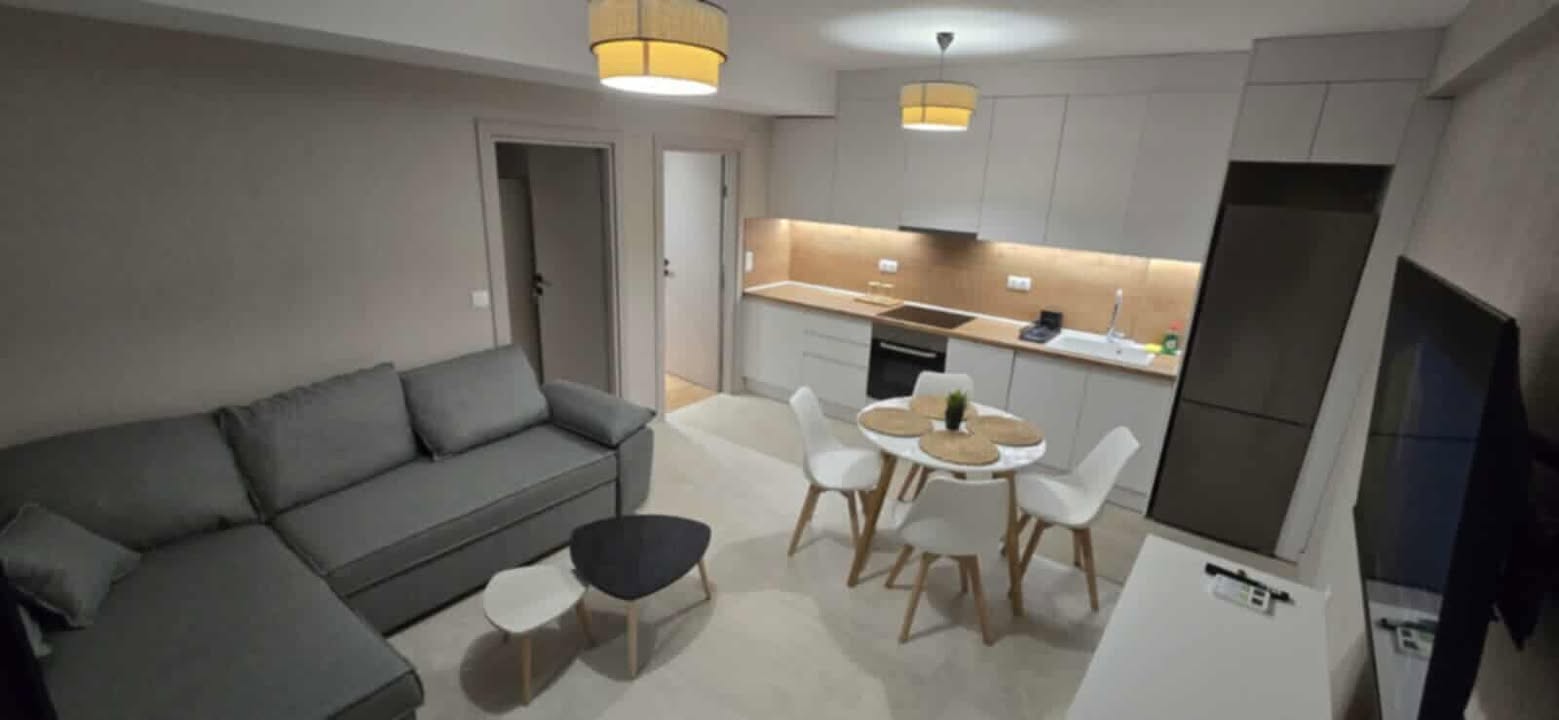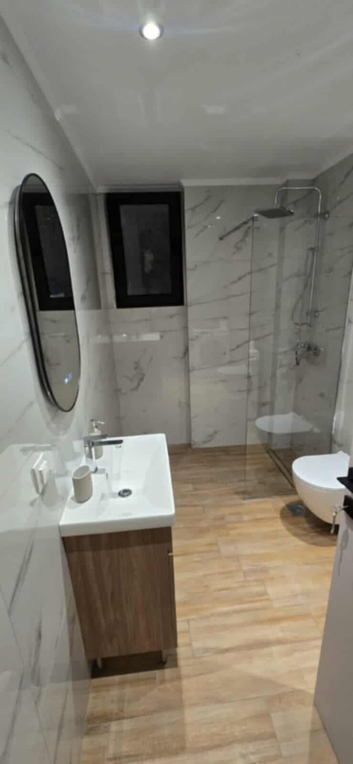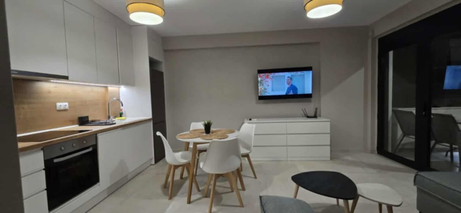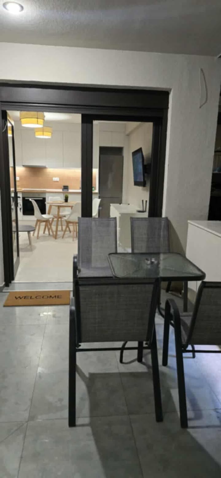Сосема нов апартман на 50 метри од плажата. Има соба со брачен кревет, кујна и дневна соба поврзани, бања и тераса. Во кујната, кревет на расклопување и може плус еден дополнителен кревет на расклопување. Кујна опремена за подготовка и сервирање храна . Има машина за перење и машина за миење садови. Има климатизација и во дневната соба и во спалната соба. Климатизацијата и Wi-Fi се вклучени во цената. Апартманот се наоѓа на приземје и има една голема тераса напред и помала на задната страна.