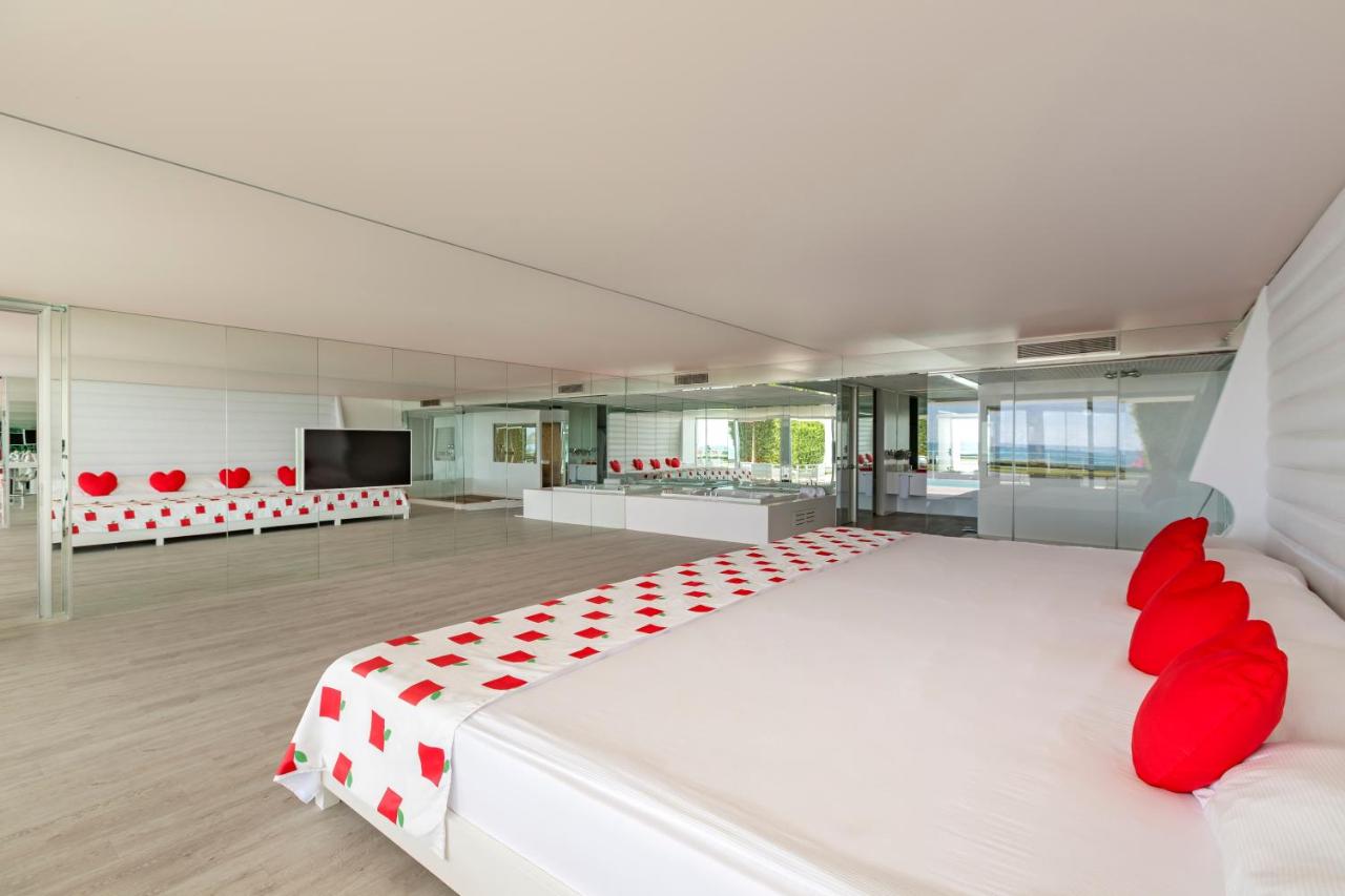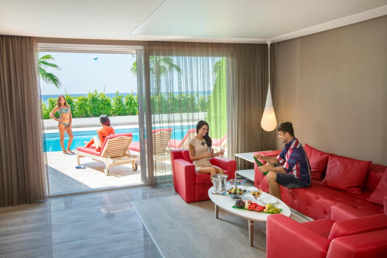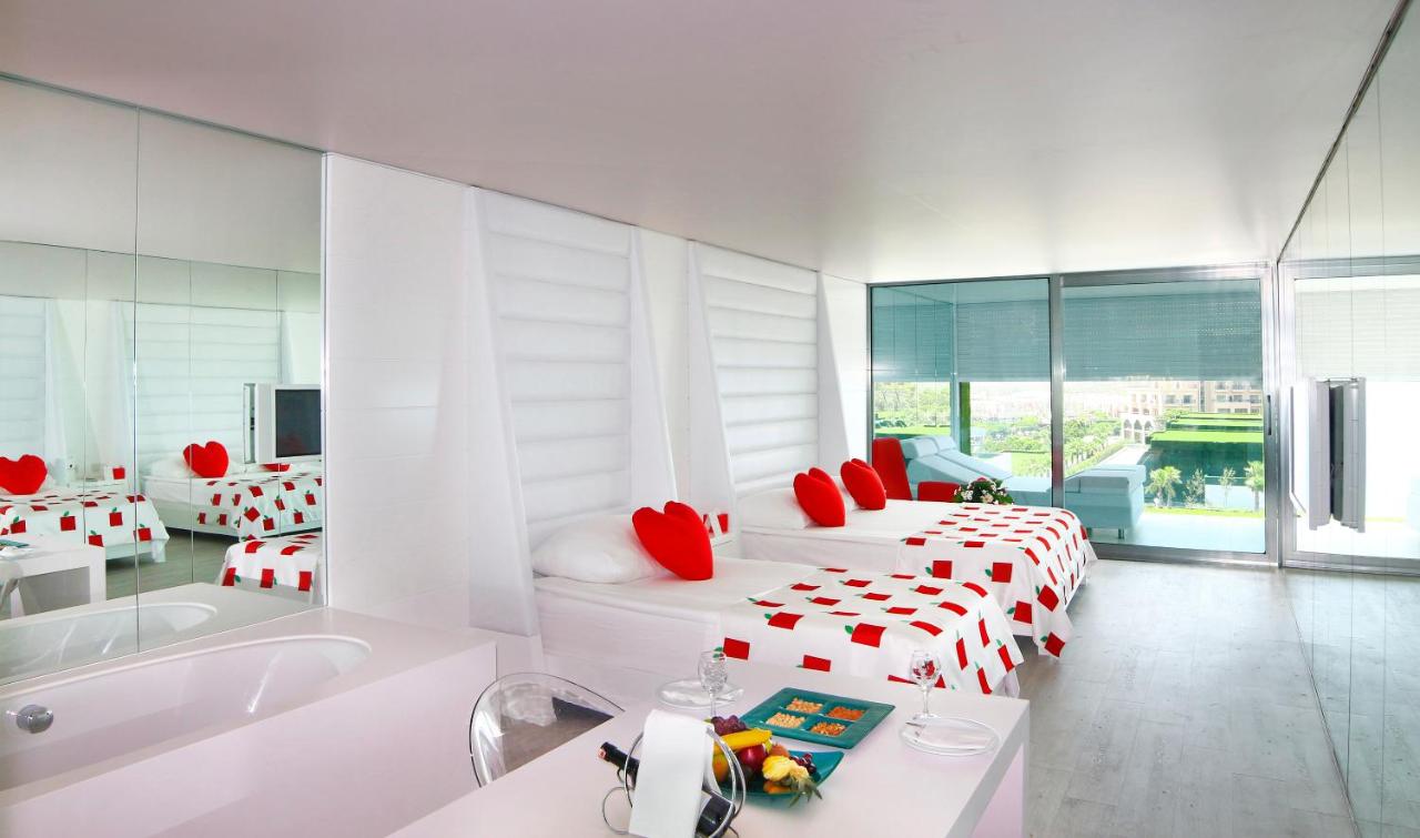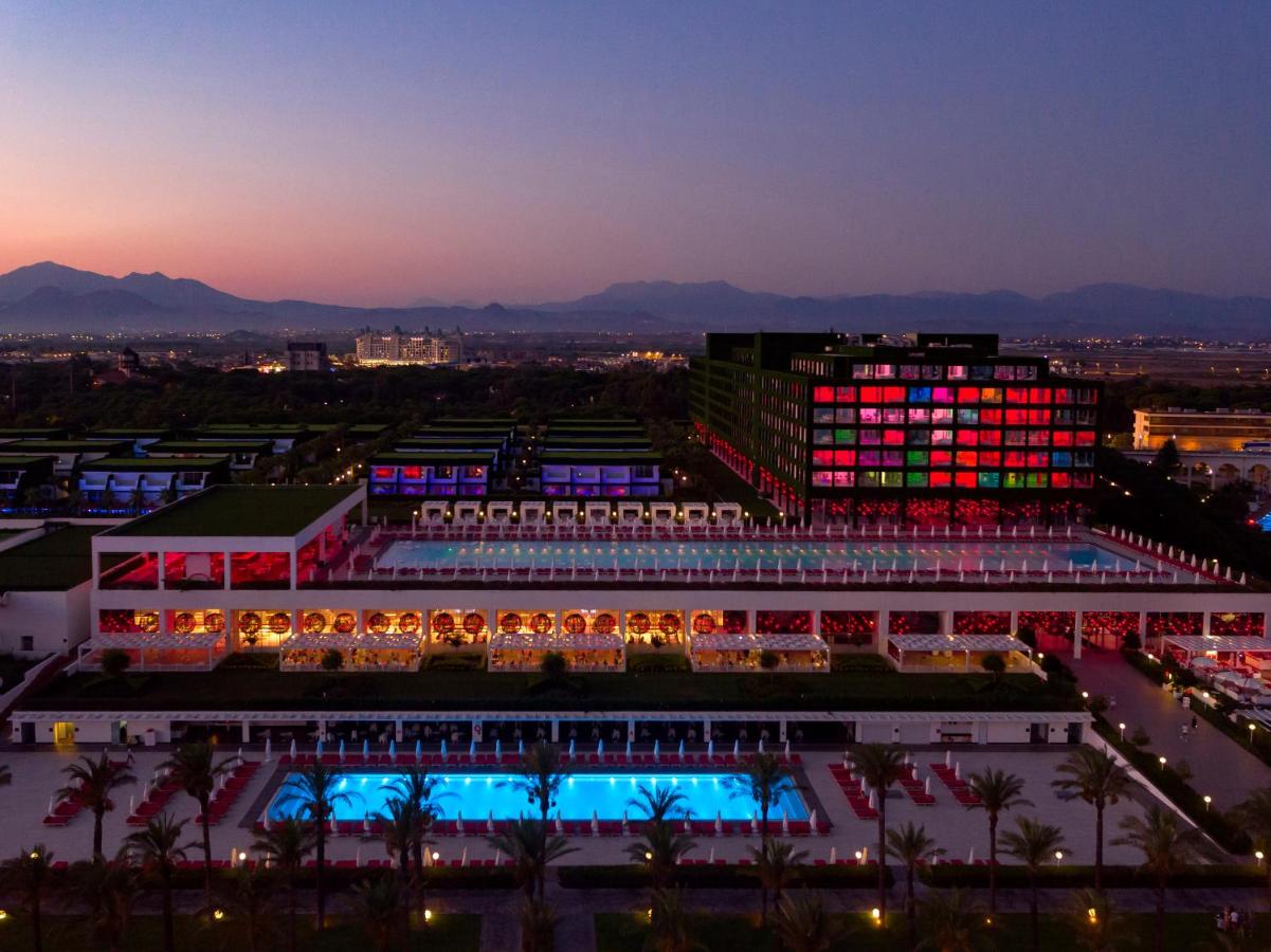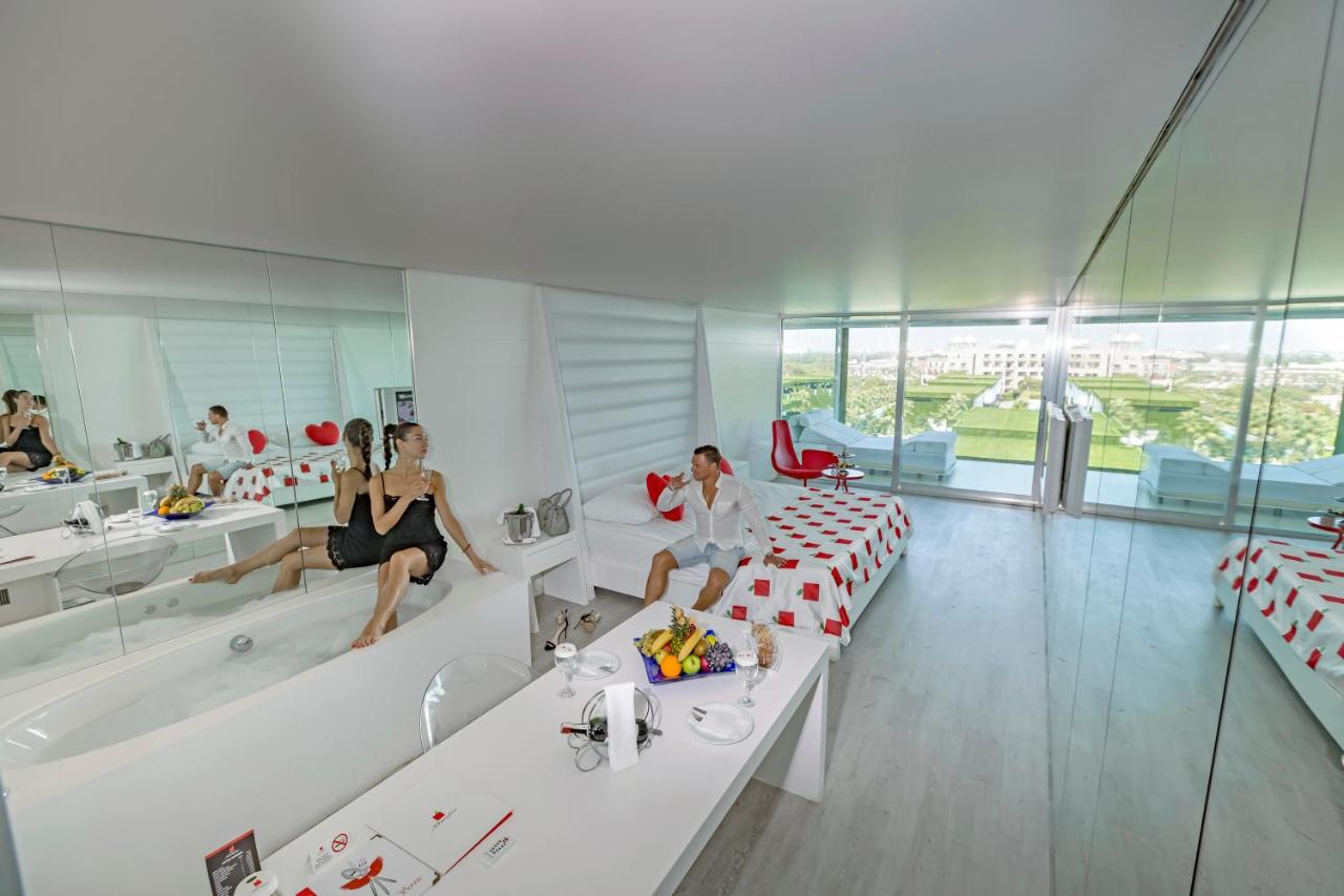 Положба Хотелот се наоѓа во областа Белек, 35 км од аеродромот во Анталија и 45 км од центарот на Анталија. Сместување Вкупно 476 соби и 68 Вили. Дизајнирани соби за меден месец (64м², поглед на море, една спална соба, бања со туш кабина / WC, една соблекувална, дизајнирани соби со црвена постелнина само првиот ден, торта со логото на хотелот, специјално вино, овал со овошје и слатки, приоритет во À la Carte рестораните, задолжително прикажување на свадбен документ не постар од 90 дена, макс.2лица), Делукс стандардна соба (64м², поглед кон море, една спална соба и бања, соблекувална, макс .3 лица), Дизајн соби со директен поглед кон морето (64m², директен поглед на море, една спална соба, една бања, соблекувална, макс.3 лица), Ladies дизајн соби (64м², поглед на море, една спална соба, една бања, соблекувална, соби кои се со декорација само за женски гости, макс.3лица), Romantic couples дизајнирани соби (64м², поглед на море, соби дизајнирани само за парови, макс.2 лица), Дизајн апартман (120м2 , една голема главна спална соба,уште едма спална соба, две купатила, една соблекувална, 70м² тераса, макс.3 лица), Кралски апартман апартман (500м², главна спална соба, уште две спални соби, една дневна соба, еден бар, една сауна, три купатила, три соблекувални, 192м² тераса, макс.6 лица), Eва Вила (200м², главна спална соба, помала спална соба, дневна соба, една сауна, две бањи, една соблекувална, пливање на тераса, макс.4лица), Адам Вила Вила (175м², главна спална соба, една дневна соба со единечен кревет, една сауна, две купатила, една соблекувална, пливање на тераса, макс.3лица), Претседателска вила (Вила за забава) ) (600m², главна спална соба, уште две спални соби, една дневна соба, бар, кујна, две сауни, три купатила, три соблекувални, приватна градина 500м² и приватен базен од 80м, макс.6лица). Сите простории во главната зграда се дизајнирани со епоксиден под, а сите sидови се со огледала, така што секогаш можете да имате поглед на море или планина. Постои и дел за одмор кој што може да го дизајнирате како кревет или седечка гарнитура, француски кревети и има ролетни со кои може да бидете разделени од надворешноста. Во просторијата има две релаксирачки бањи за две лица со светлечки третман во боја. Одделна бања со туш кабина, фен за коса. Посебен одделен плакар (соблекувална), LCD телевизор од 106 см, мини бар (вода, безалкохолни пијалоци и пиво се надополунваат секој ден) со мултифункционална маса, сет со кафе и чај, клима што работи според временски услови, телефон, WI-FI(нормална брзина), балкон. Услуга Ултра сѐ вклучено - појадок, доцен појадок, ручек, попладневна ужина, вечера и доцна ноќна ужина, мини бар дневно надополнети, сите локални и стандардни увезени алкохолни и безалкохолни пијалоци, отворена услуга за сладолед за време на ручекот и вечерата, диетално мени. Не се вклучени: луксузни увезени пијалоци, флаширани пијалоци, свежо цедени сокови (освен за појадокот), À la Carte ресторани се со претходна резервација, услуга во соба, макси бар во соба, ВИП-концепт за меден месец парови, сместени во Диско клуб и шоу центарот, специјална роденденска торта и цвеќиња. Содржини Главен ресторан за сѐ вклучено услуга, À la Carte ресторани: Arrigato - јапонска кујна, Sark I - турска кујна, Mezes - морска храна, Stek house ресторан, Basilico - италијански ресторан, Eros - Ресторан Афродизијак само за парови, Blind ресторан - вечера во темнина. Барови низ целиот хотелски к