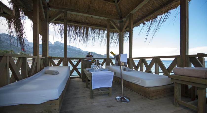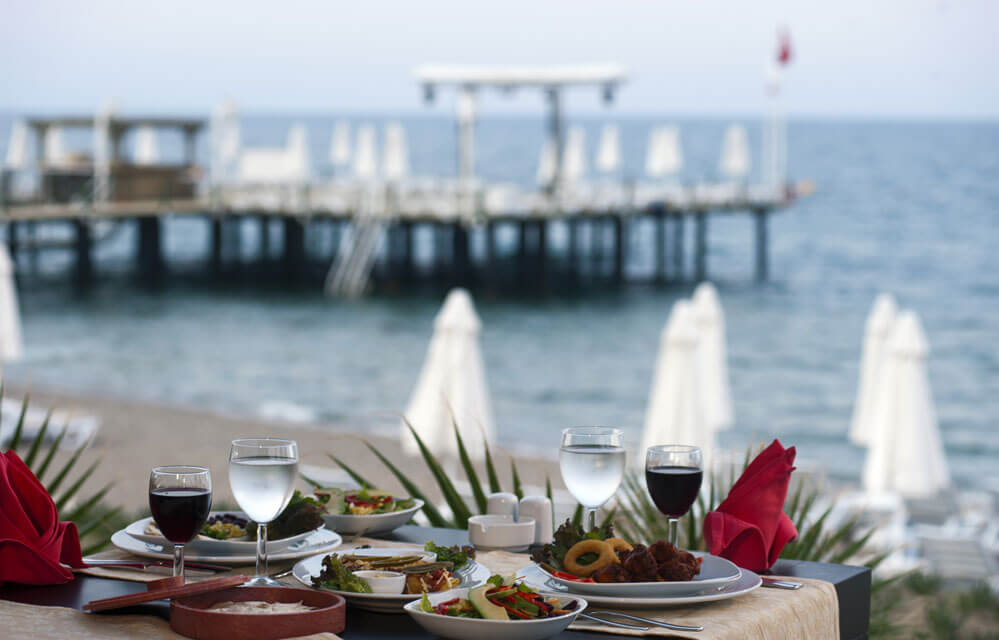 Главен ресторан Aspendos, A’la Carte ресторани (Starfish-рибен ресторан, Azure-медитеранска кујна, La Fiesta-мексиканска кујна, Ottoman-Турска кујна, Flora-скара), барови околу хотелскиот комплекс, Диско клуб. Доктор, чување деца, перална и хемиско чистење, телефон, факс, компјутерски игри, фризер, продавници, rent a car, дополнително се наплаќаат. Wi-Fi интернет бесплатен во лоби бар до 56Kbps.