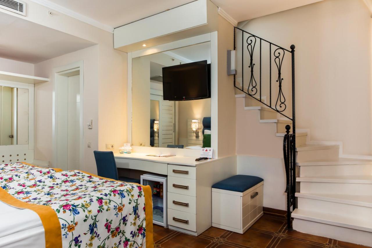 Ultra All Inclusive 24 часа домашни и неколку увозни освежителни и алкохолни пијалоци во главните ресторани и во многу барови Оброци-бифе Меѓуоброци Snack во текот на денот во Beach Bar Пити и турски специјалитети во текот на денот во Agora Meyhane Топли пијалоци и слатки во Caffe Central Сладолед во точно определено време Плажата и базените Плажа со камчиња Beach bar Дрвена платформа над море со душеци за сончање Голем базен со декоративни мостови Внатрешен базен Бесплатни чадори, лежалки и крпи за на плажа Деца Базен за деца Мини-клуб (4-12 години) Се наплаќаат Рестораните a la carte Водните спортови со мотор Масажите Билијардот Водните скии Собата за игри Куглањето