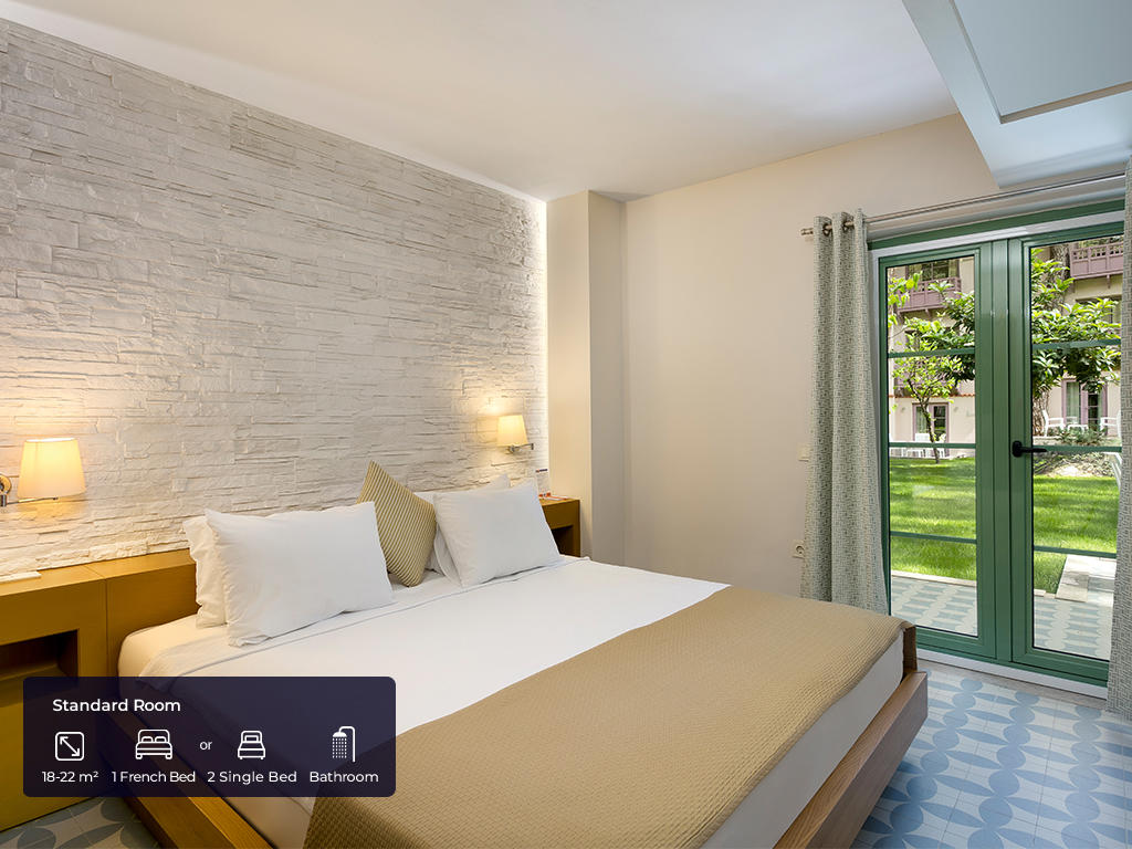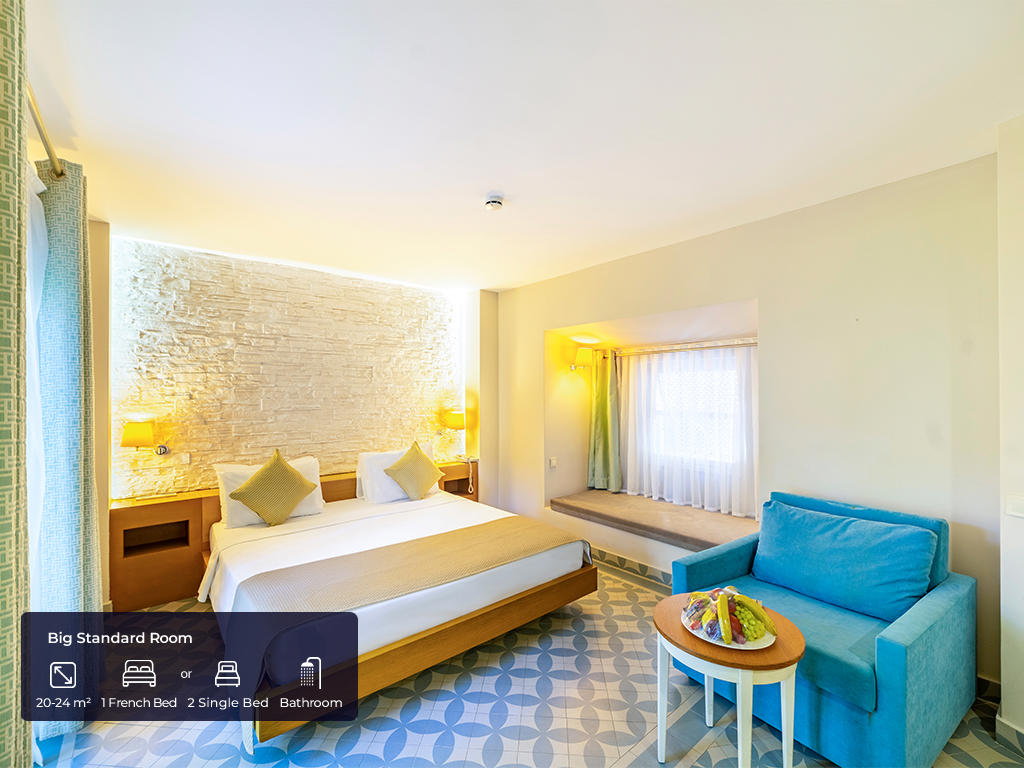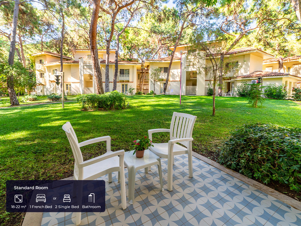 Сите соби се во прекрасна градина во блокови со три ката, со сопствено купатило со туш кабина, фен за коса, систем за климатизација што работи според временските услови, телефон, сеф, мини бар, сателитска ТВ и музички канали, керамички под и балкон или тераса.