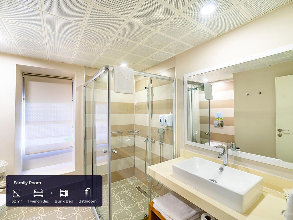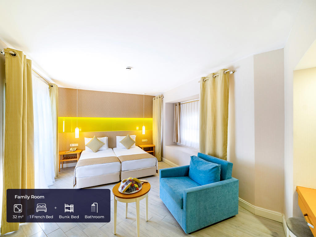 Фамилијарни соби (32 m², две спални соби одвоени со врата, со едно или две купатила, во втората соба има кревет на спрат за деца, макс.4 лица).